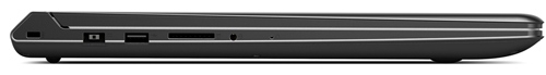 Все интерфейсы расположены в ноутбуке лишь на боковых гранях, причем их не настолько много, чтобы боковины казались переполненными. Так, левая сторона располагает портом USB 2.0, кардридером, читающим MMC/SD/SDXC/SDHC, комбинированным аудиоразъемом и гнездом питания. Также здесь предусмотрен слот Кенсингтонского замка.