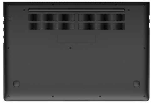 Так же на дне имеется вентиляционная решетка, прикрытая противопылевой сеткой и две щели для выхода воздуха. Чтобы обеспечить зазор и беспрепятственную циркуляцию воздуха между ноутбуком и поверхностью, на которой он стоит, а так же для нормальной работы сабвуфера, на дне корпуса имеются две «точечные» резиновые ножки и дополнительный «подъем» в виде так же резиновой полоски.