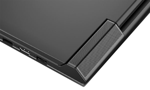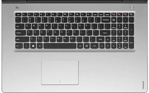 Акустика в этом ноутбук слилась с дизайном. Мало того, что 3 Вт сабвуфер на задней панели выделили красным, так еще и основные 2 Вт динамики запрятали по углам клавиатуры под красные «стоп-фонари». Около левого из них есть три заветные буквы JBL, обозначающие, что за звук Dolby Home Theater в Y700-17ISK отвечает акустика этой известной фирмы.