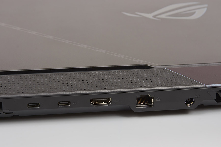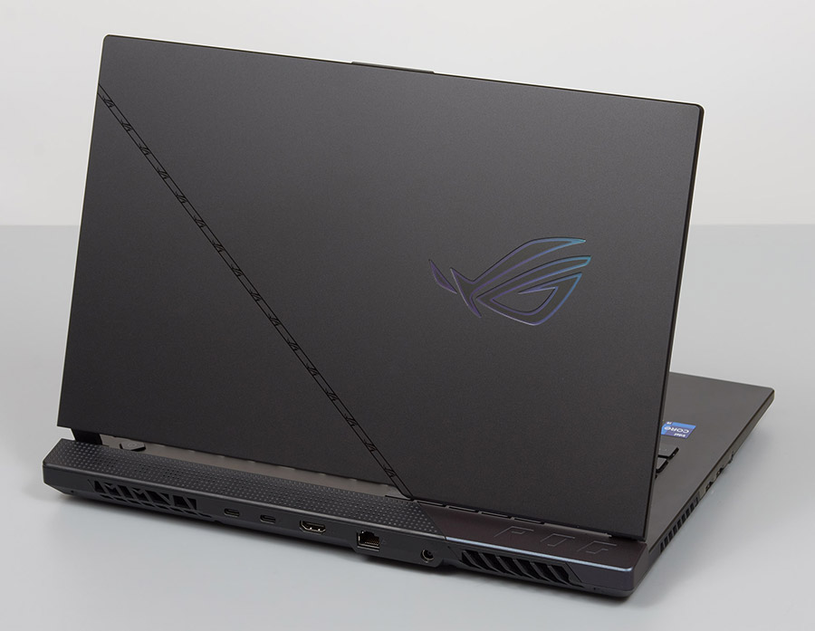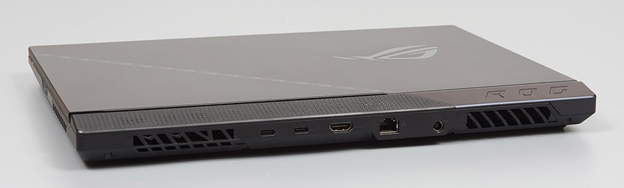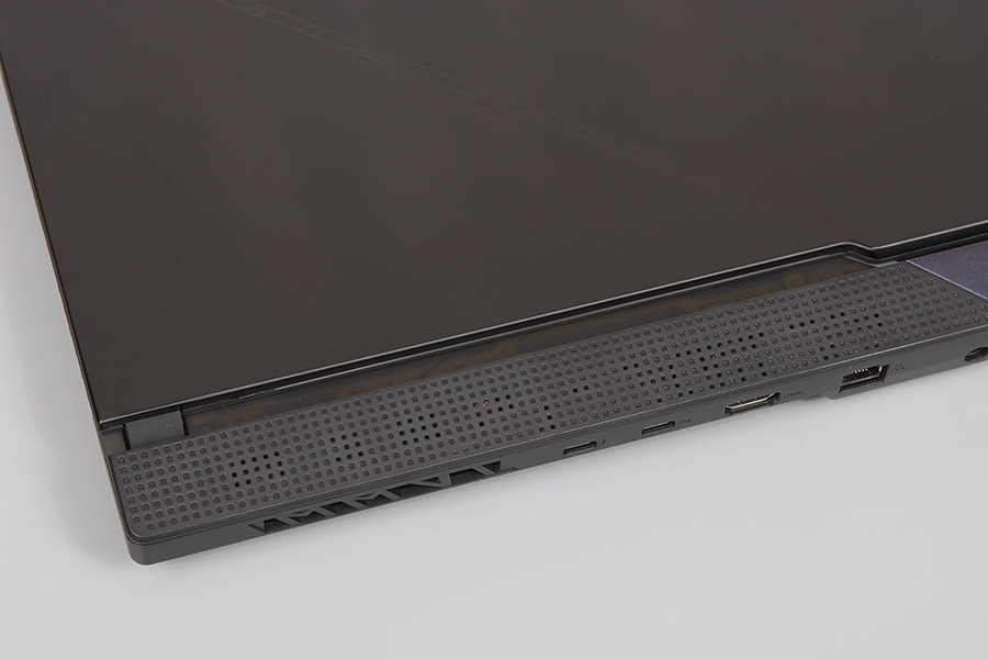 Остальные интерфейсы определены на дальнюю от пользователя сторону. Здесь мы находим круглый разъем питания, RJ-45, HDMI 2.0b, USB-C 3.2 Gen 2 и USB-A 3.2 Gen 1. По краям расположились решетки для вывода нагретого воздуха. Причем они никак не перекрываются дисплеем, так как в открытом положении крышка располагается над корпусом.