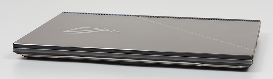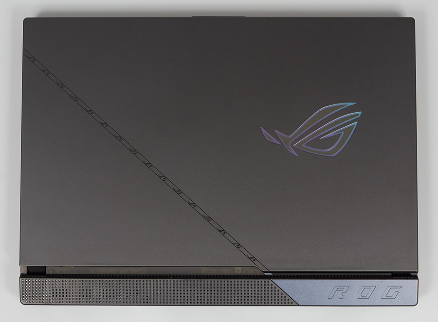 Верхняя крышка из металла получила темное матовое покрытие. Логотип ROG серебристый и обладает белой подсветкой. Часть пространства украшена текстурой в виде мелких точек. Этот же акцент продолжается и на пластиковой вставке у основания крышки. Здесь же можно увидеть вентиляционную решетку для доступа воздуха.