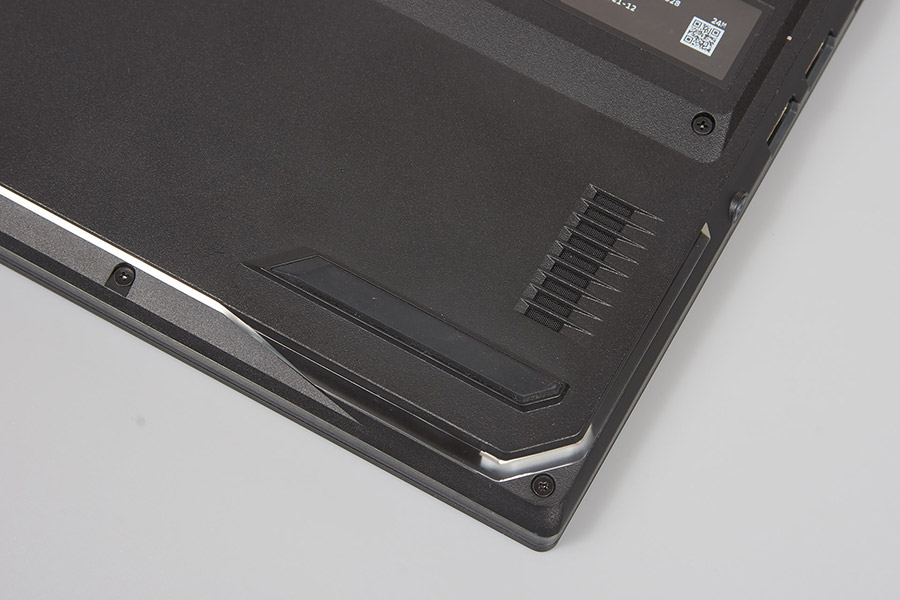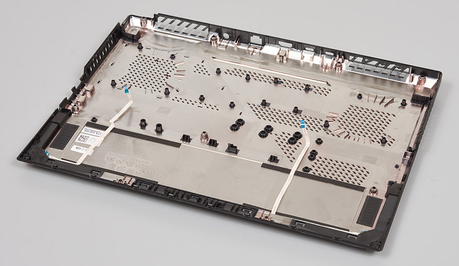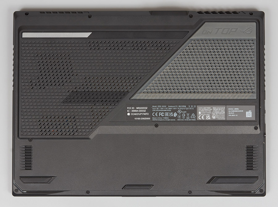 Снизу корпус закрыт единой крышкой, закрывающей и торцы корпуса. Крупные резиновые ножки хорошо фиксируют ноутбук на столе, а обильная перфорация позволила максимально облегчить доступ воздуха к внутренним компонентам. Ближе к пользователю слева и справа можно увидеть решетки динамиков. Также крышку опоясывает прозрачный световод подсветки.