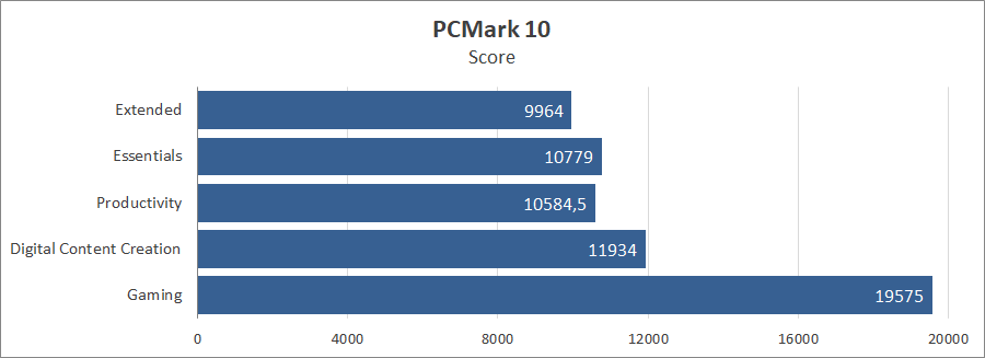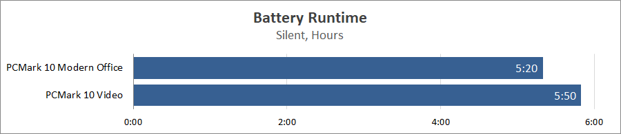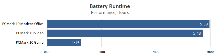 Для проверки времени работы от аккумулятора было проведено несколько тестов с помощью PCMark. Тест Modern Office симулирует комбинированную офисную нагрузку. Второй тест измеряет время работы при воспроизведении видео формата Full HD, а Game позволяет понять, сколько сможет проработать ноутбук под игровой нагрузкой. Яркость экрана зафиксирована на 120 кд/м², чтобы сравнить результаты с другими ноутбуками. Подсветка клавиатуры выключена.