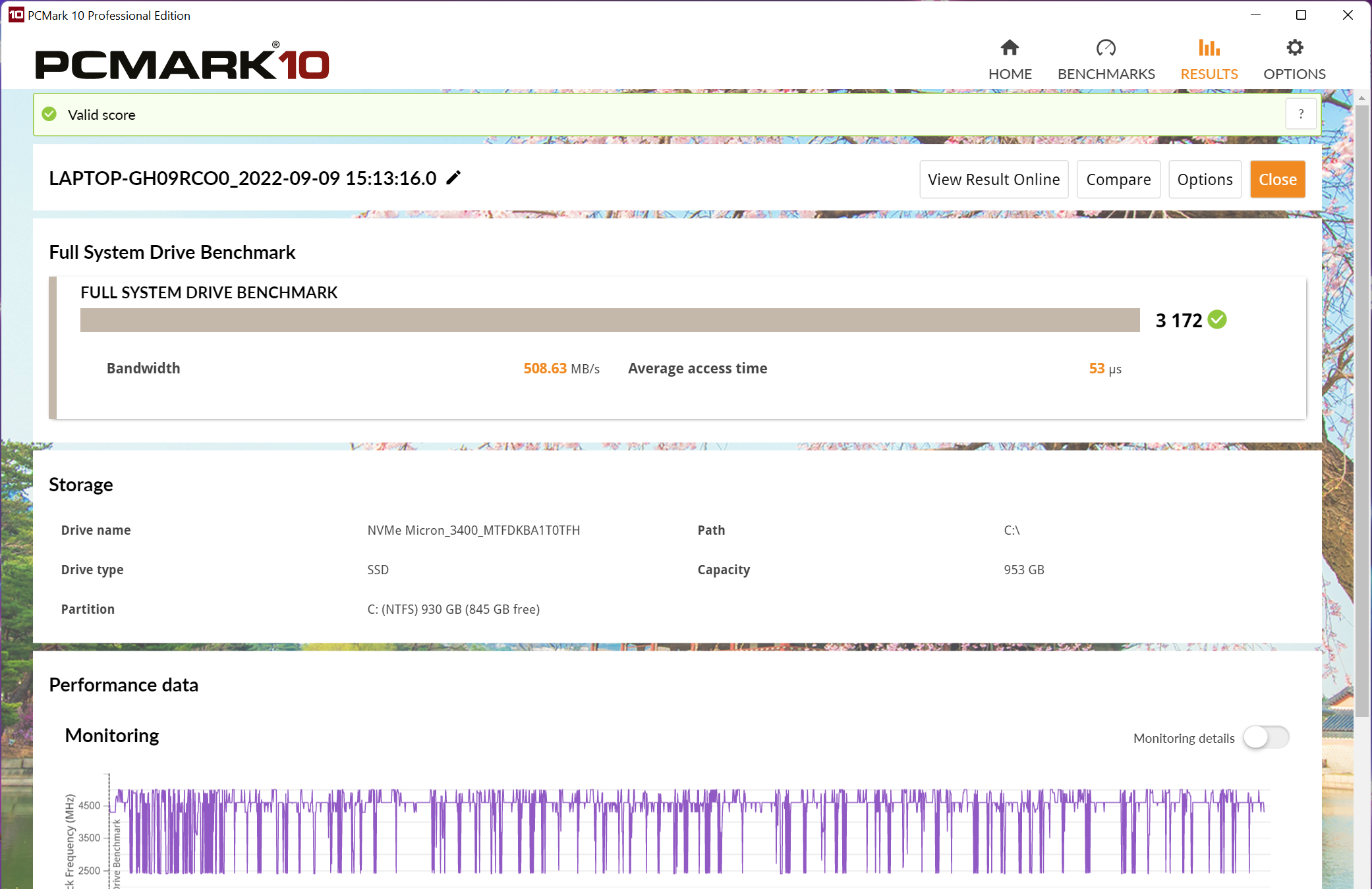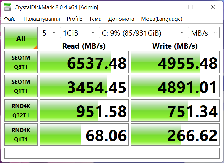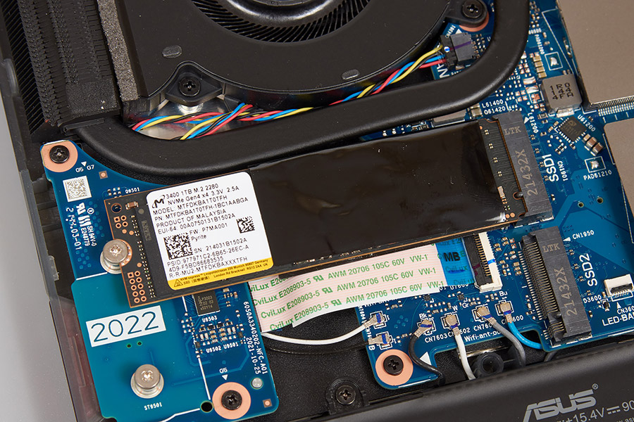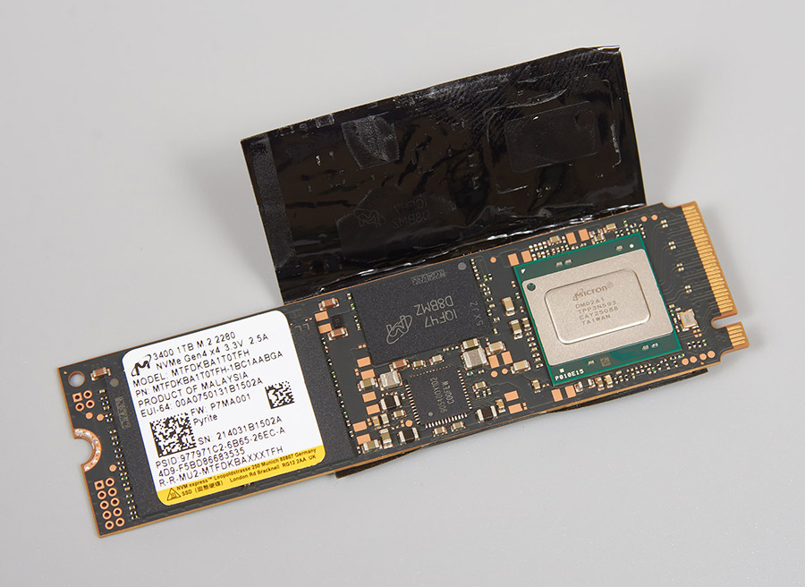 Установленный NVMe-накопитель Micron 3400 емкостью 1 Тбайт. Это современный SSD с интерфейсом PCI Express 4.0 на основе контроллера Micron DM02A1. Такой накопитель можно встретить в розничном магазине, как Crucial P5 Plus. Рядом есть еще один разъем M.2 под формат 2280, что позволит установить дополнительный SSD.