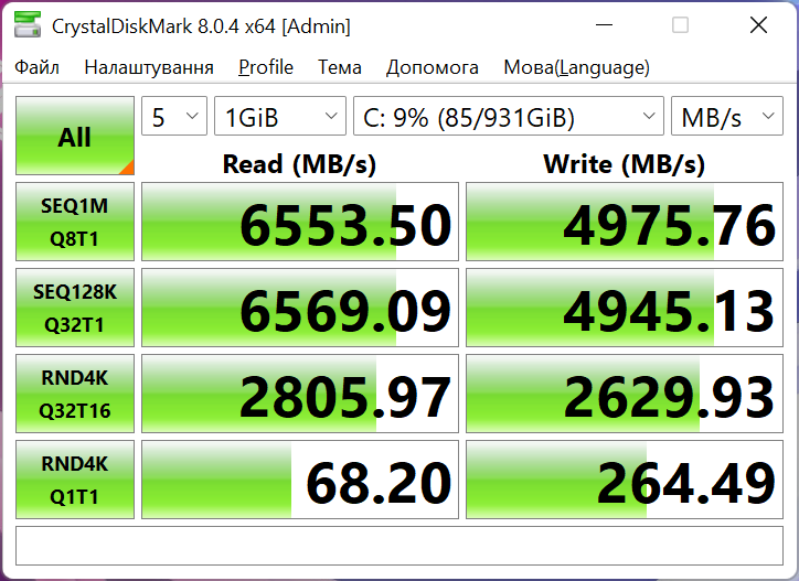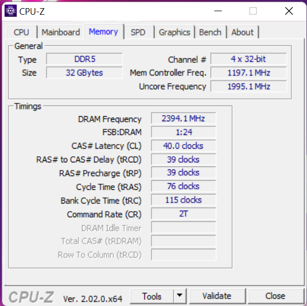 Два модуля DDR5 работают в двухканальном режиме на эффективной частоте 4800 МГц с таймингами 40-39-39-76-2T. Общий объем составляет 32 ГБ.