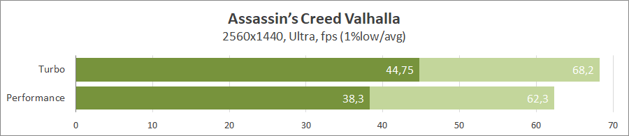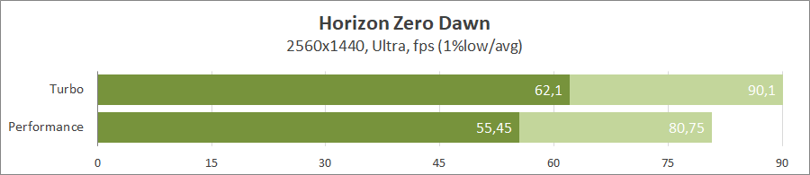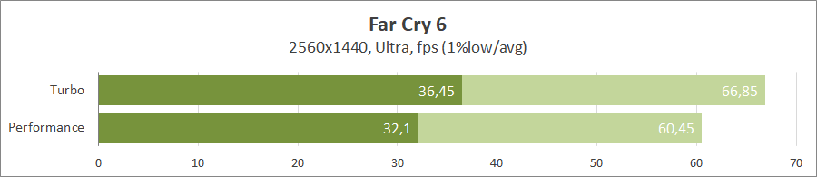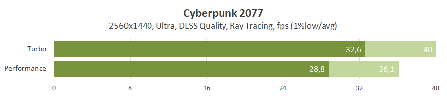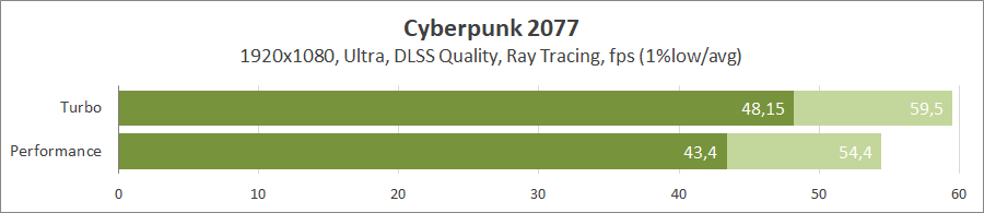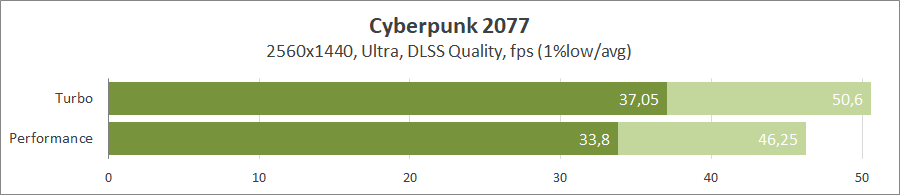 Тестирование было проведено в режиме Performance и Turbo. Игры протестированы при разрешении 2560×1440, только для Cyberpunk 2077 применялся еще и режим 1920×1080.