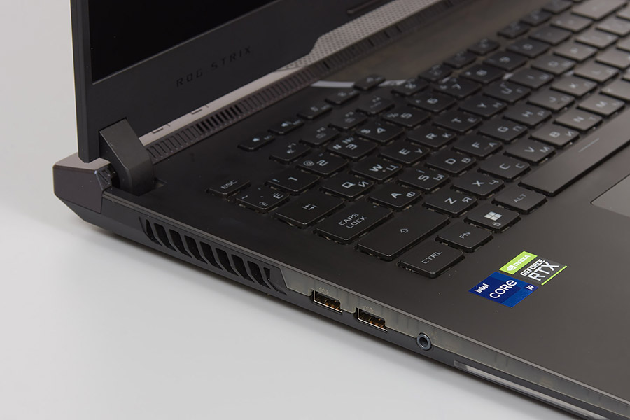 Также для свободного потока воздуха есть решетки с левой и правой сторон ноутбука. Слева есть два порта USB 3.2 Gen1 Type-A и комбинированный аудио-разъем для подключения гарнитуры.