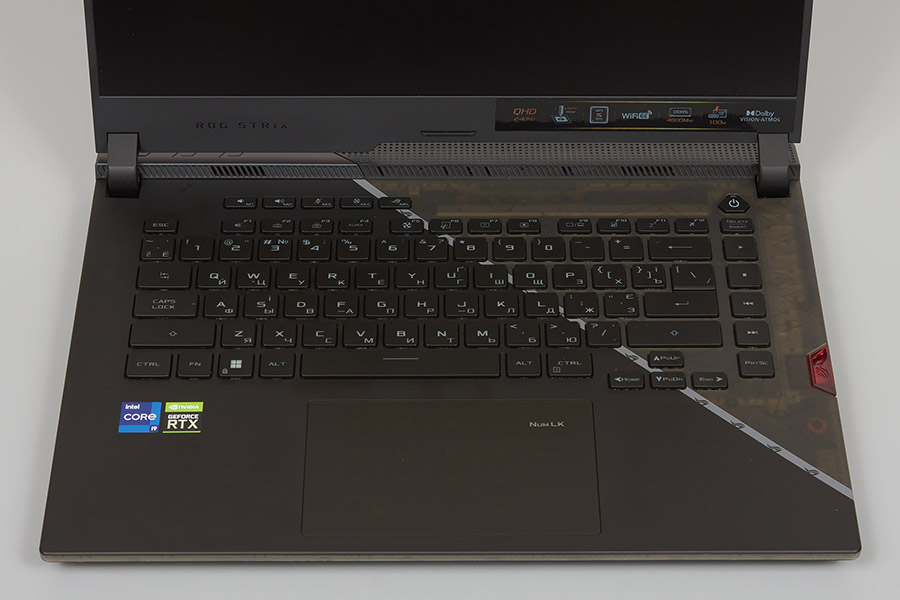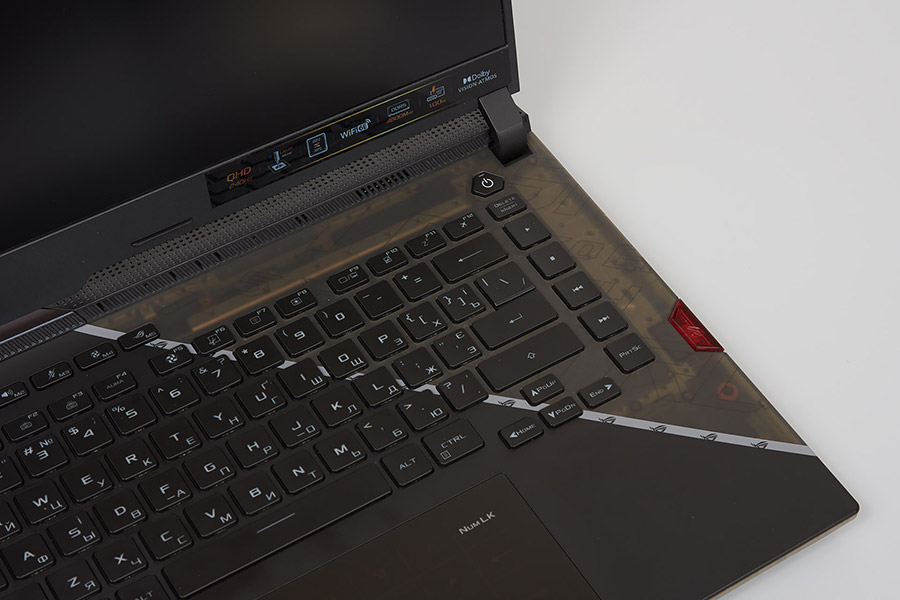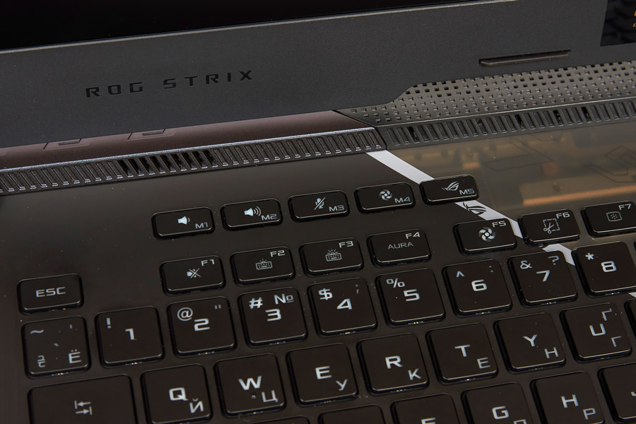 Выполнение скрытого петлевого механизма сделало данную модель хорошо узнаваемой и позволило безошибочно определять ее принадлежность именно к семейству ROG Strix. Правда, будучи базовой моделью герой обзора не получил некоторые фирменные фишки, доступные в других моделях. Например, это можно увидеть на примере клавиатуры, о которой сейчас и расскажем.