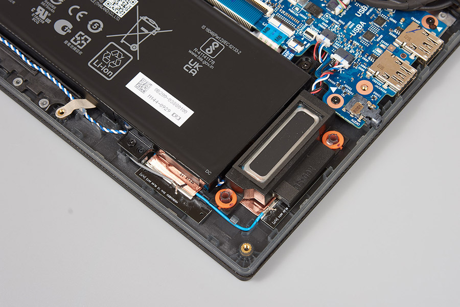 Внутреннее пространство скомпоновано достаточно типично. Ближе к пользователю размещена батарея, а под клавиатурой находится материнская плата. По количеству свободного пространства хорошо видно, что модель с увеличенной диагональю дисплея конструировали с применением тех же компонентов, которые использовались и в базовом ноутбуке.