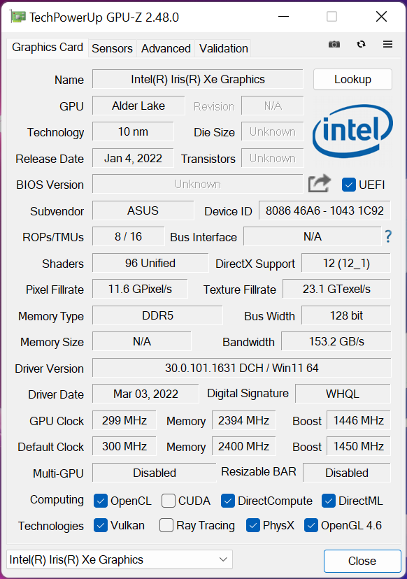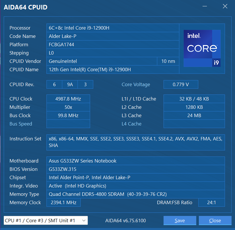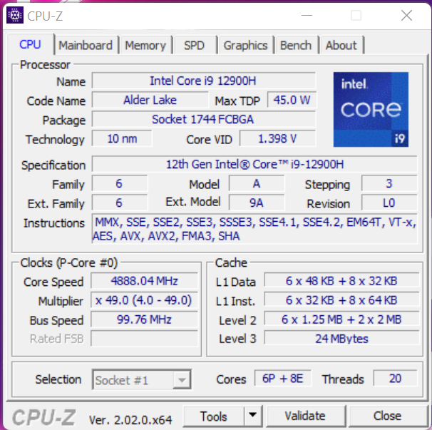 Теперь взглянем на компоненты более тщательно. Сердцем устройства является процессор Core i9-12900H семейства Alder Lake, насчитывающий шесть производительных ядер из Hyper-Threading и восемь энергоэффективных ядер, обрабатывая одновременно 20 потоков данных. Он работает на базовой частоте 2,9 ГГц, но в режиме Turbo Boost может разгоняться до 5 ГГц. Заявленная базовая мощность 45 Вт с максимальным значением в Turbo-режиме до 115 Вт.