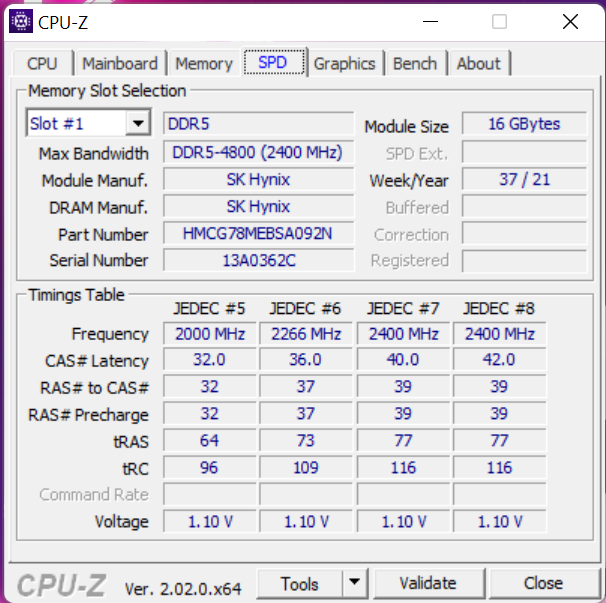 Два слота памяти заняты модулями SO-DIMM стандарта DDR5-4800 производства SK Hynix.