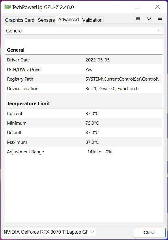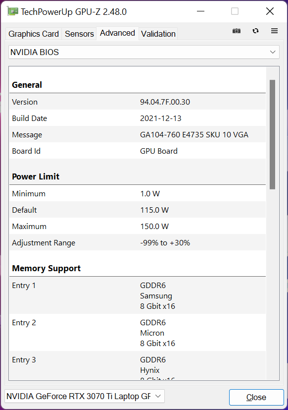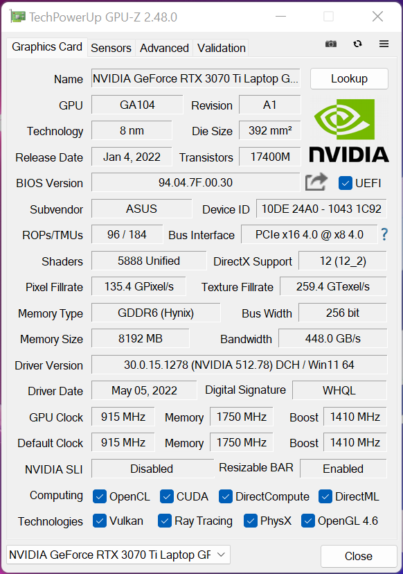 За обработку графических данных при нагрузке отвечает мобильная видеокарта GeForce RTX 3070 Ti. Ядро GA104 орудует 5888 шейдерными блоками, что поменьше чем в настольной карте, но достаточно для игры в современные проекты. Видеокарта может разгоняться до 1410 МГц, но есть ограничения по мощности на уровне 115 Вт с поднятием TGP до 150 Вт. Используется восемь гигабайт памяти GDDR6 на 256-битной шине с эффективной частотой 14000 МГц. В 2D за картинку отвечает графическое ядро Intel Iris Xe с 96 шейдерными блоками.