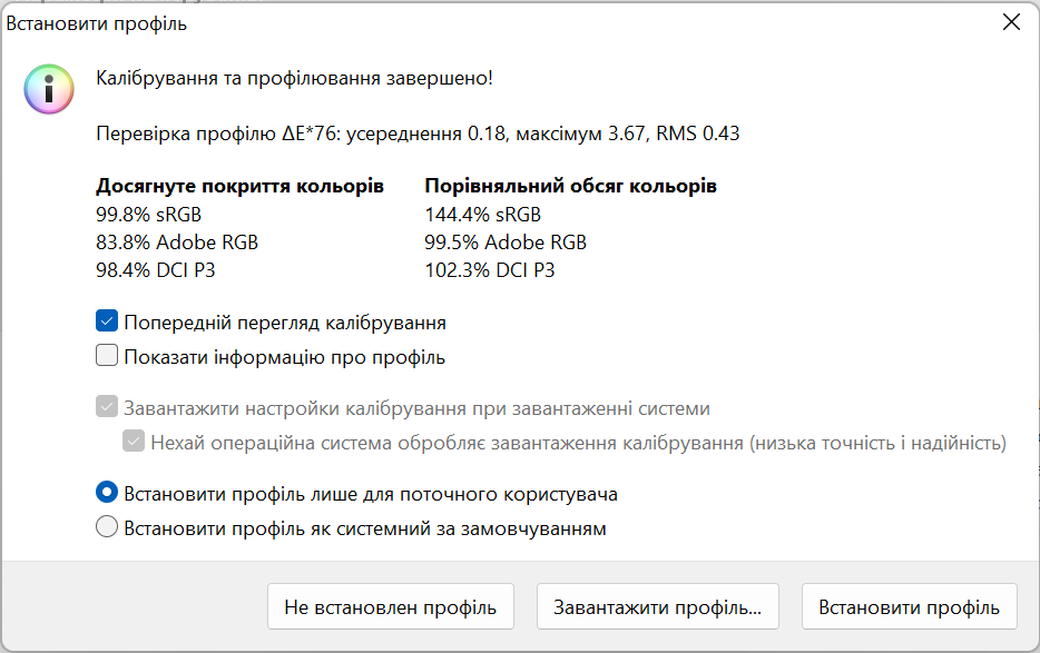 С такими настройками удалось получить точность покрытия цветового диапазона на уровне 99,9% для sRGB и 98,6% для DCI P3!