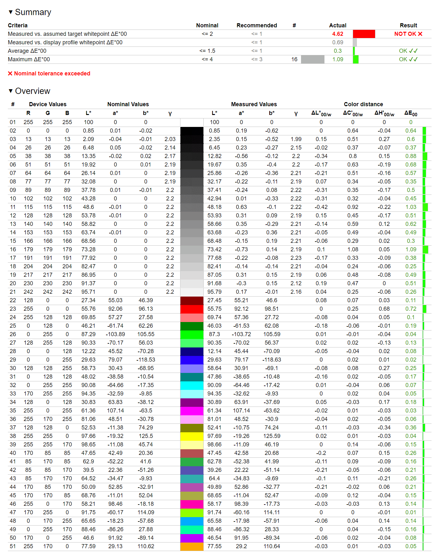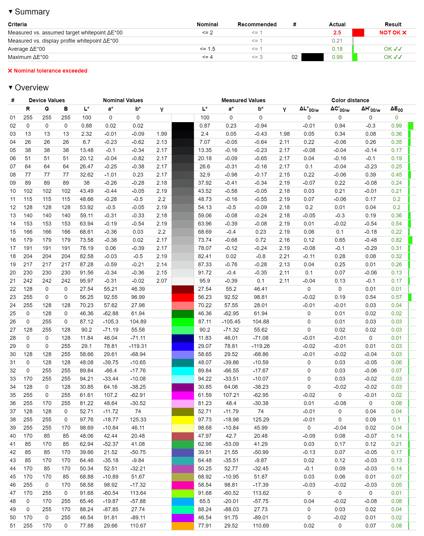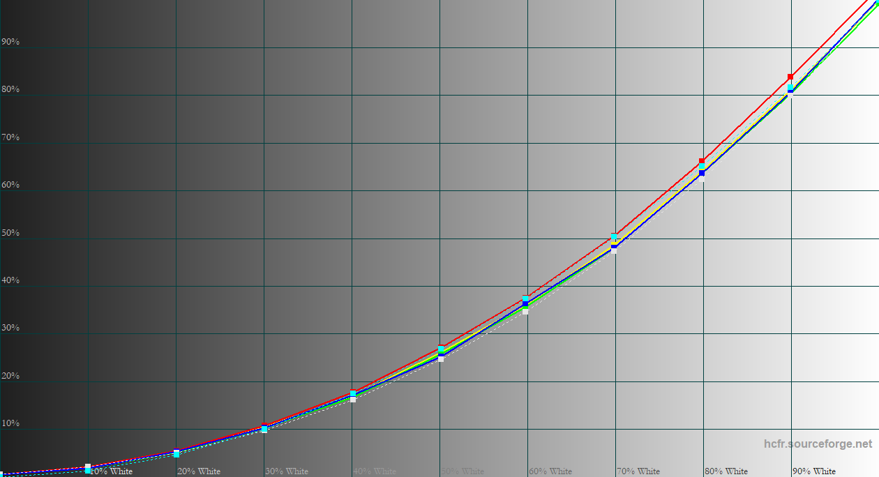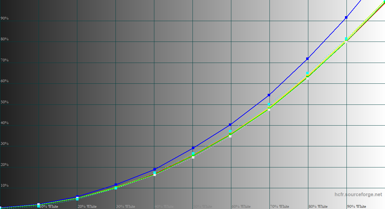 Оба графика показывают хорошую стабильность отображения каждого из цветов. Все графики расположились максимально близко к референсным показателям. Это хорошие показатели.