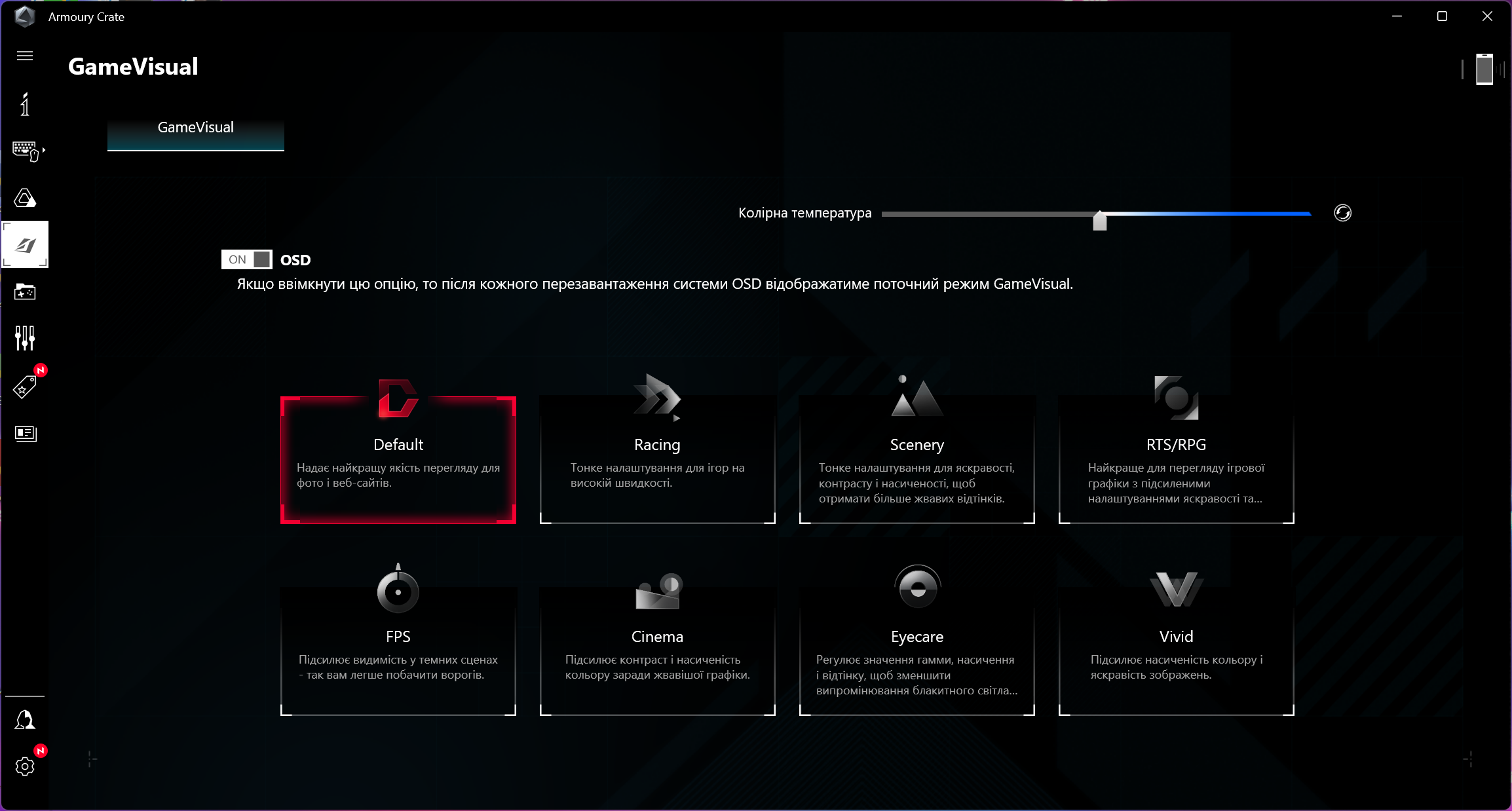 Фирменное приложение Armoury Crate позволяет настроить цветовую температуру и для значения в 6500К нужно было выбрать 15 единиц при 50 заводских.