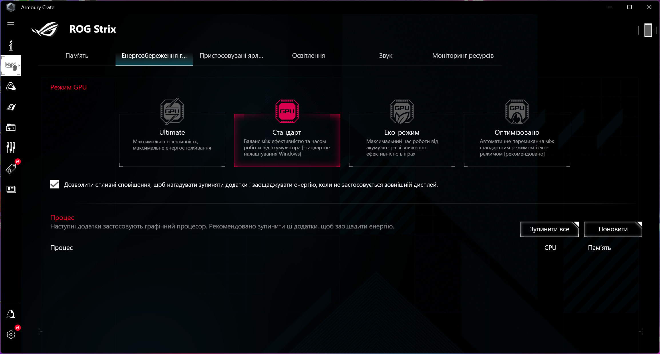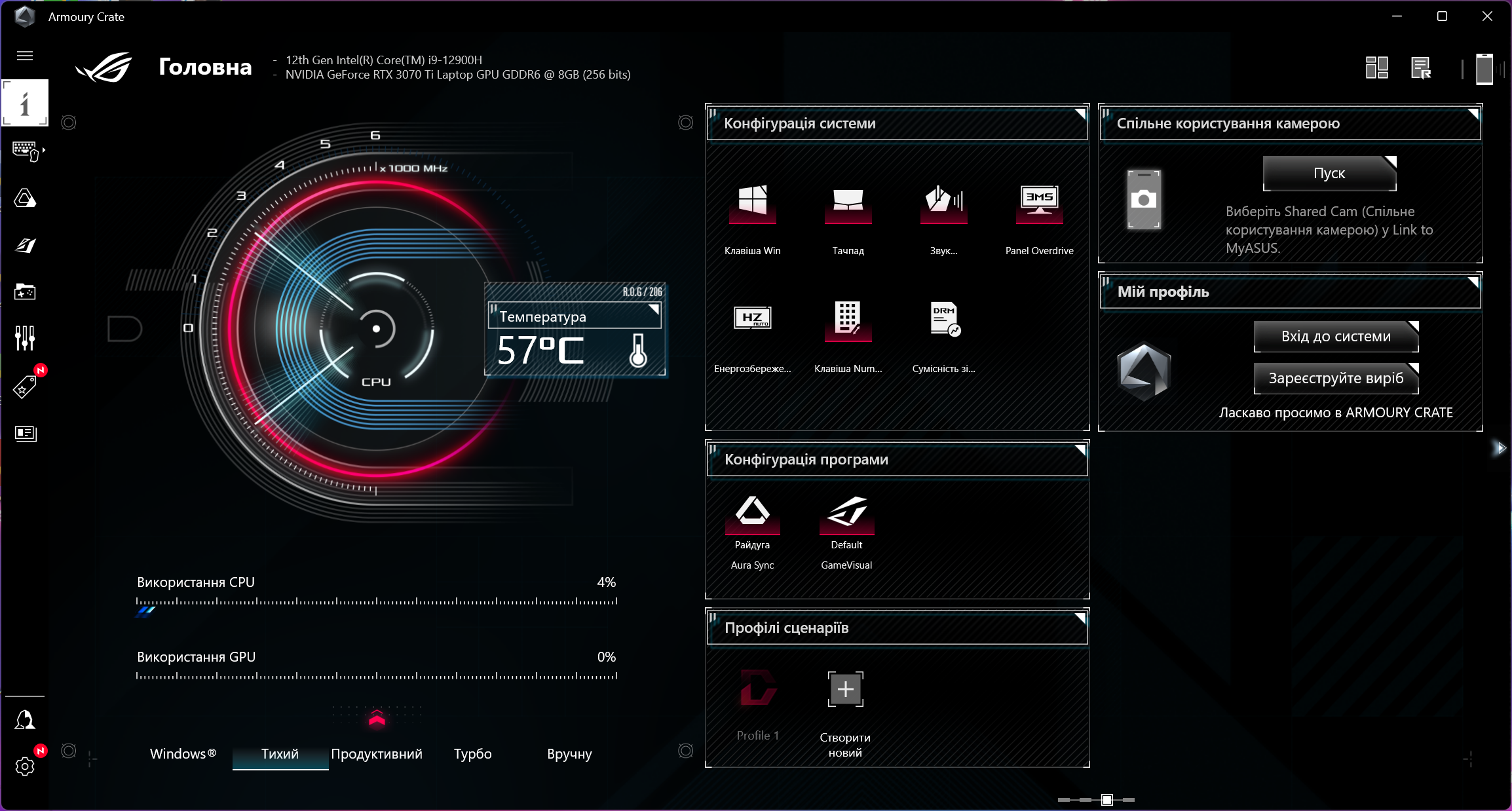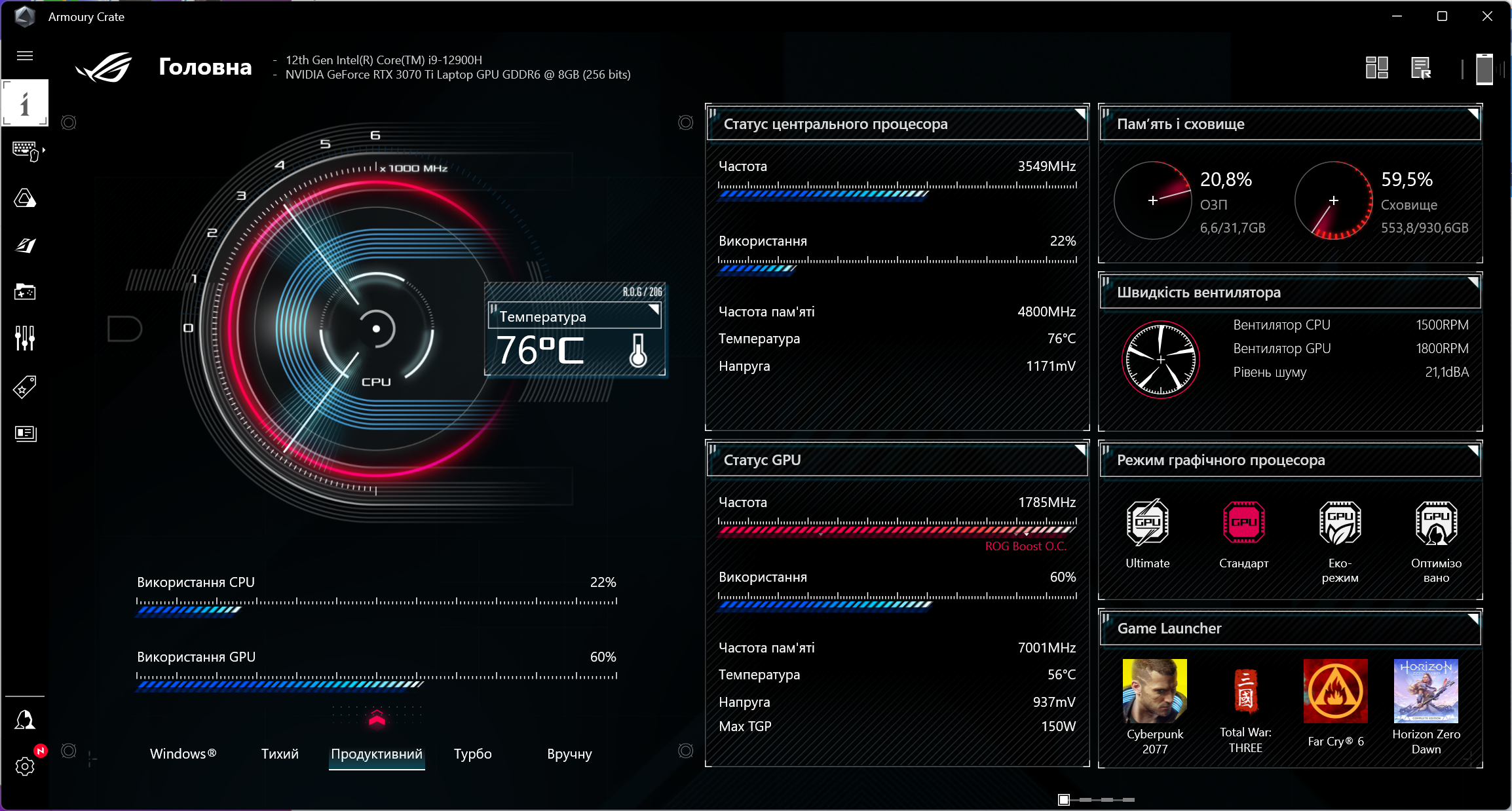 Производитель также комплектует свои ноутбуки фирменными утилитами, призванными упростить работу со многими параметрами. Например, утилита Armoury Crate отображает сведения о состоянии центрального процессора и видеокарты и позволяет менять режимы производительности.