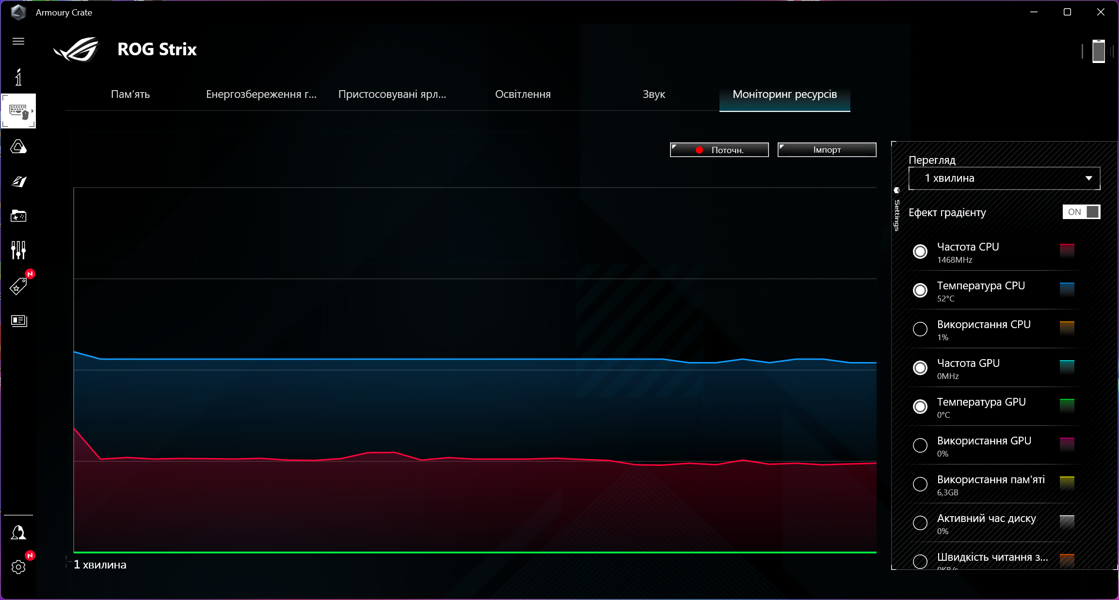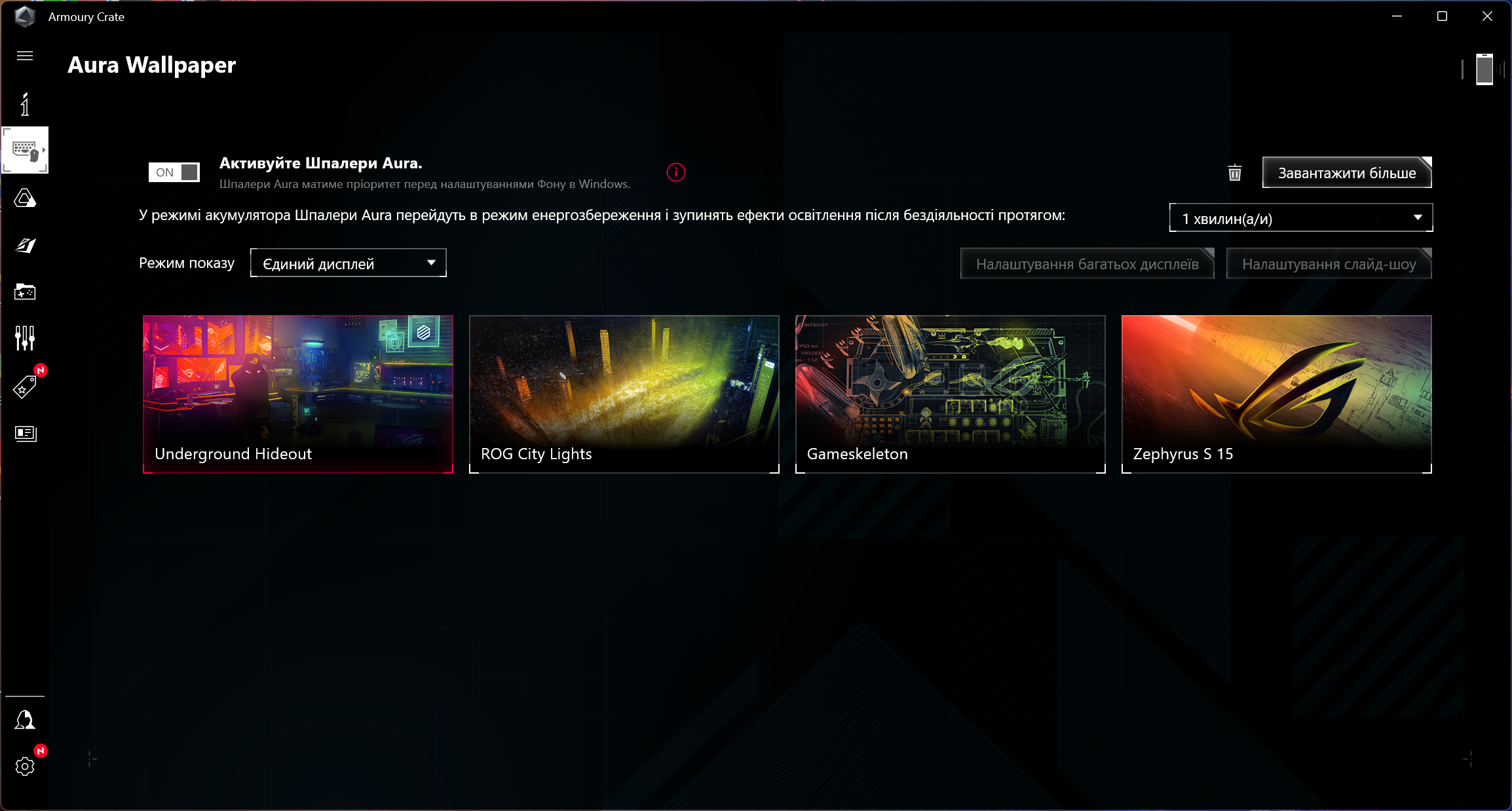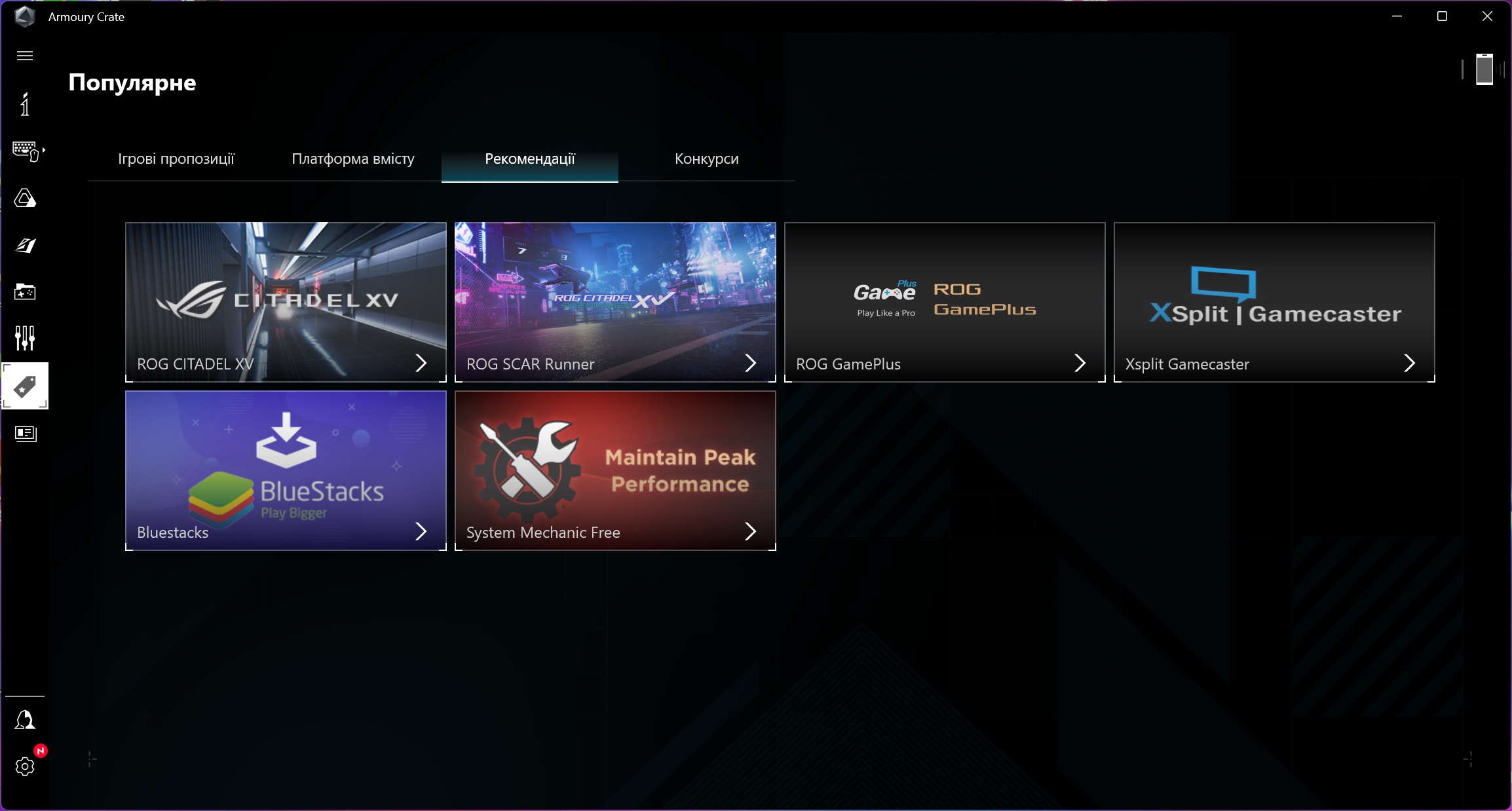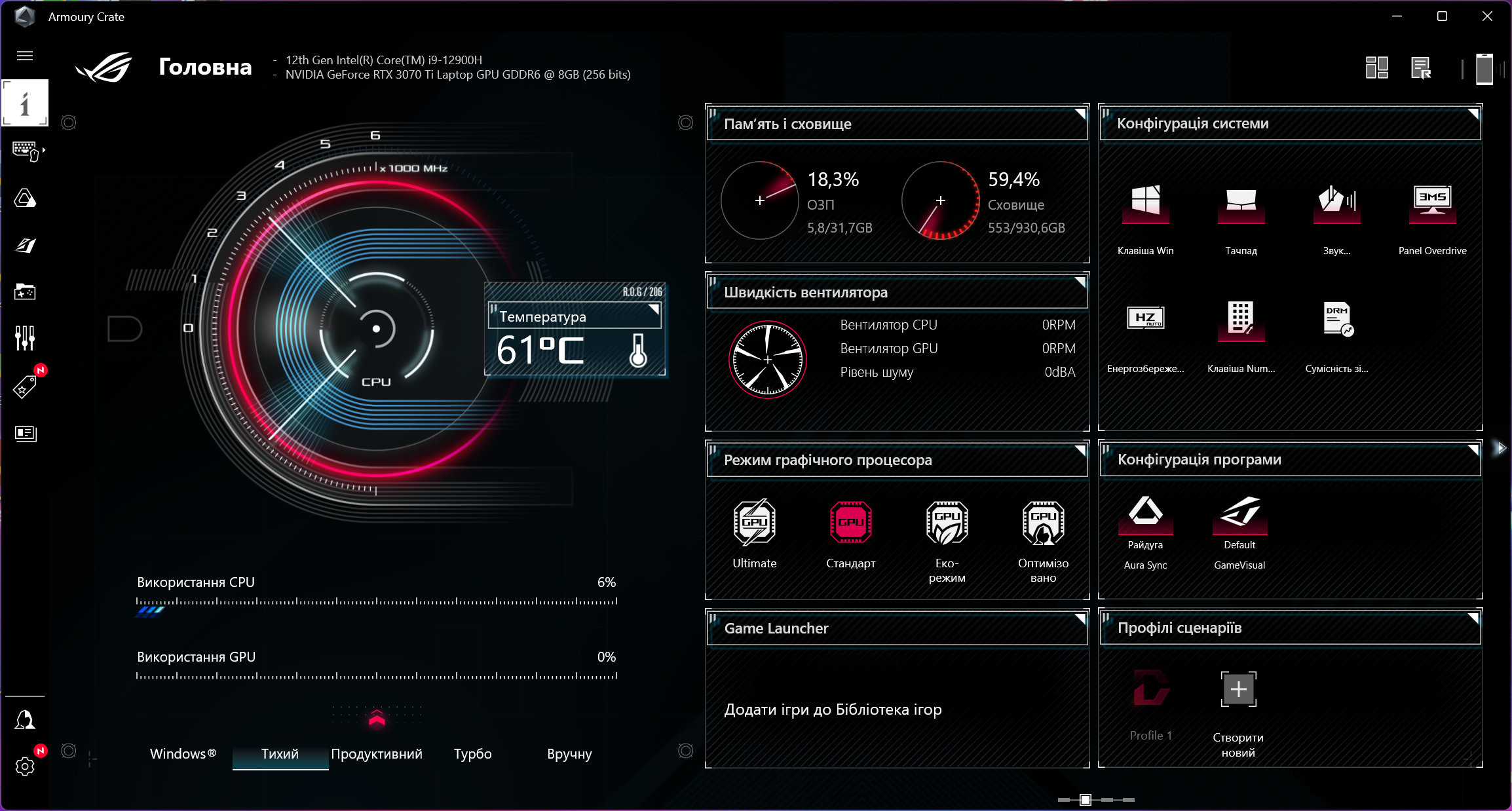 С установленной ОС поставляется два программных комплекса. Первый из них — ASUS Armoury Crate, отвечающий за мониторинг, настройку рабочих режимов и подсветки, создание профилей пользователя и многое другое.