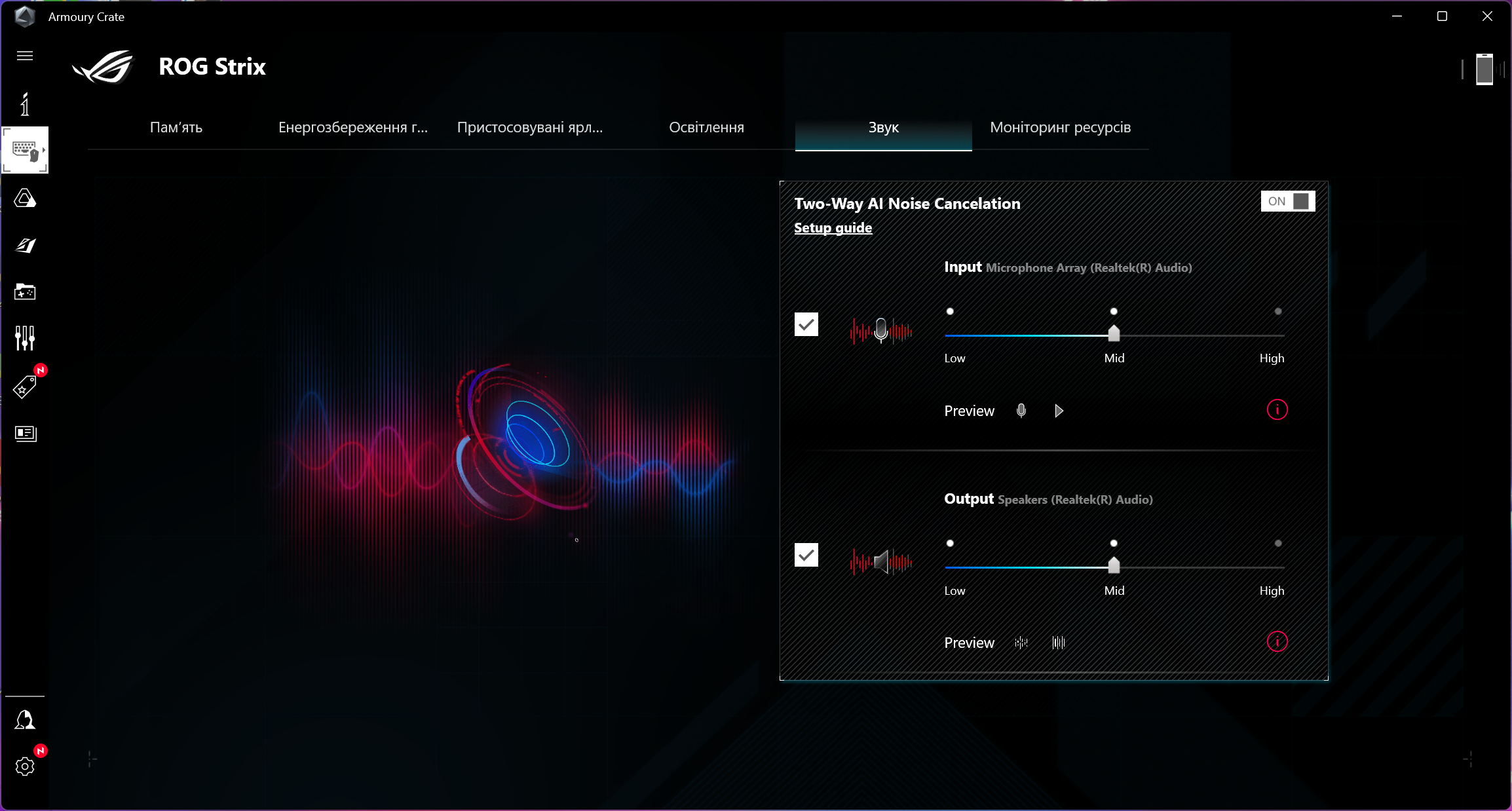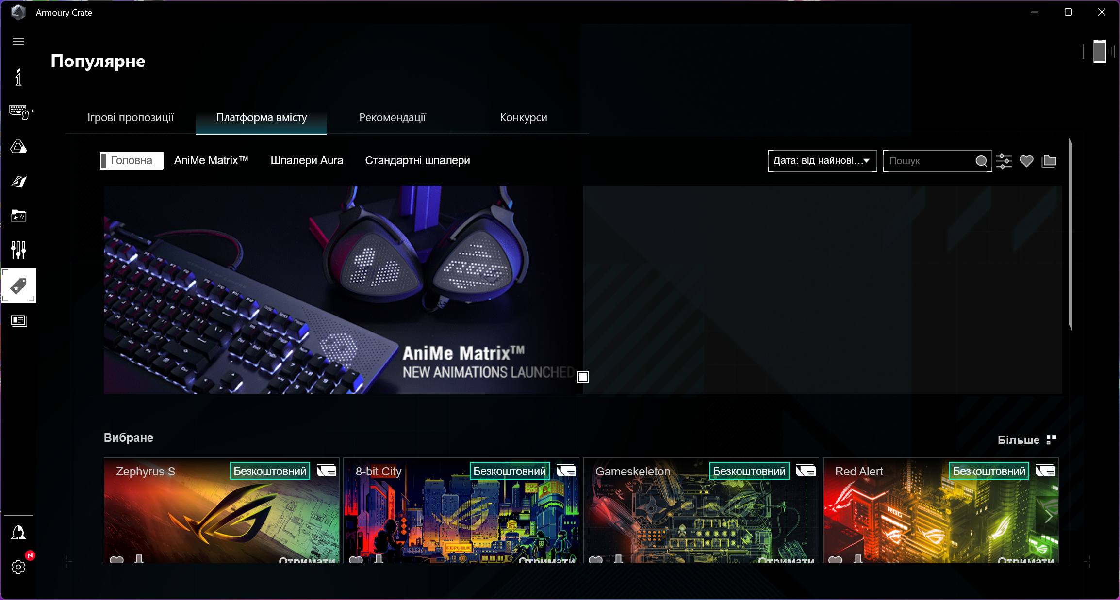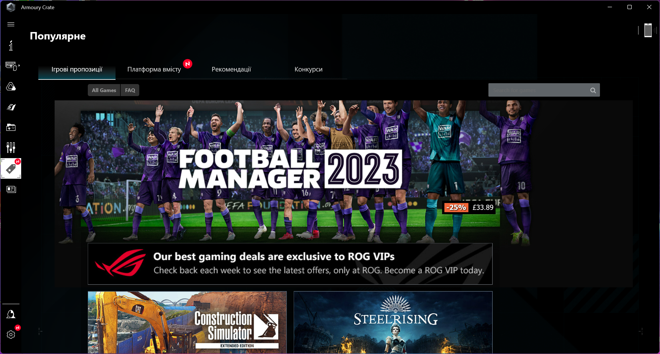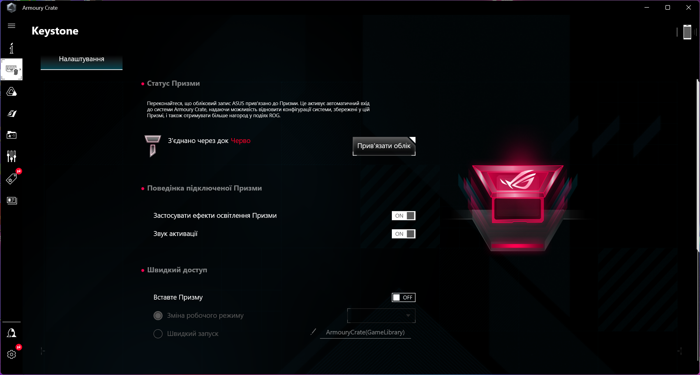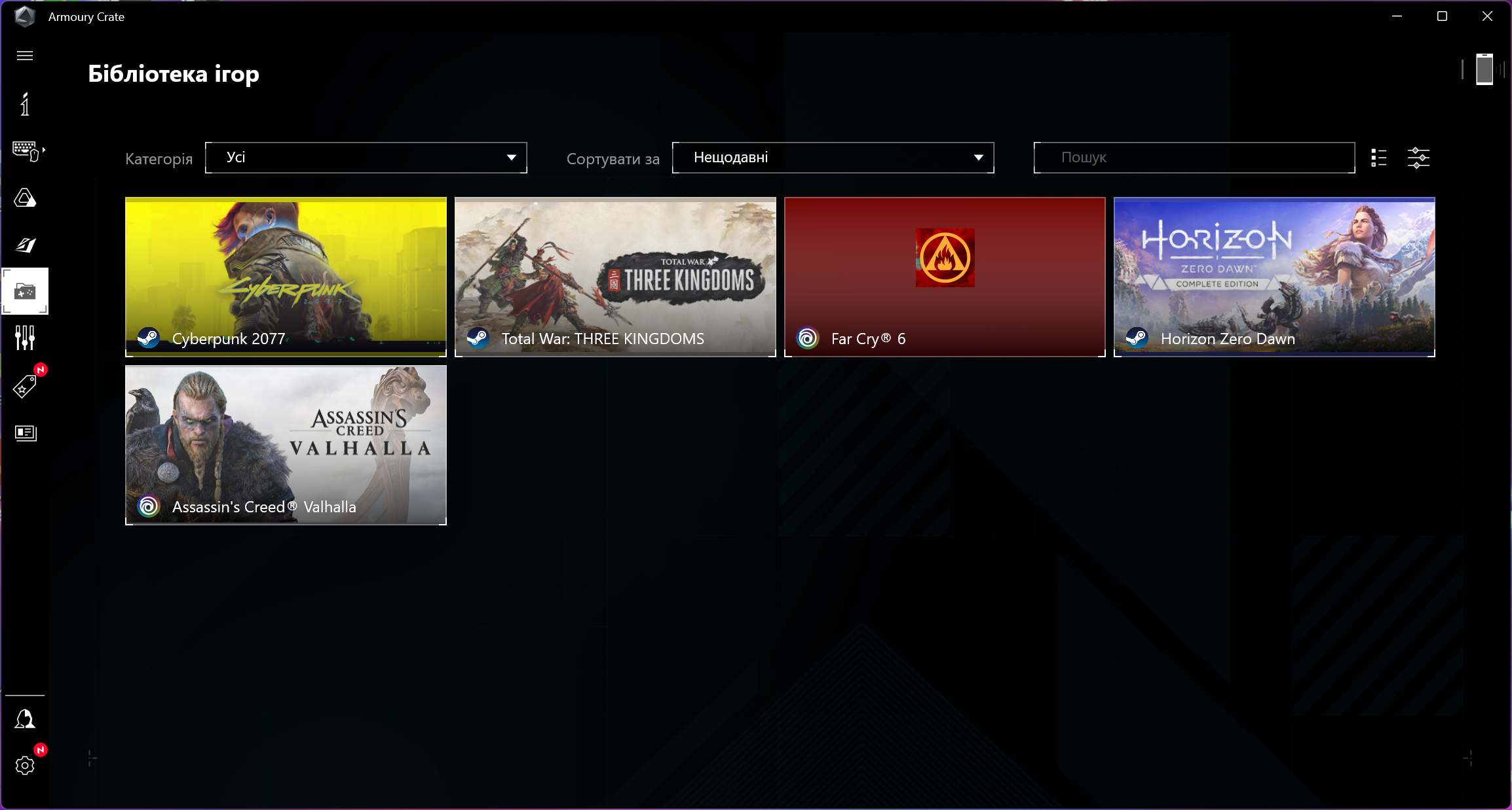 С установленной ОС поставляется два программных комплекса. Первый из них — ASUS Armoury Crate, отвечающий за мониторинг, настройку рабочих режимов и подсветки, создание профилей пользователя и многое другое.