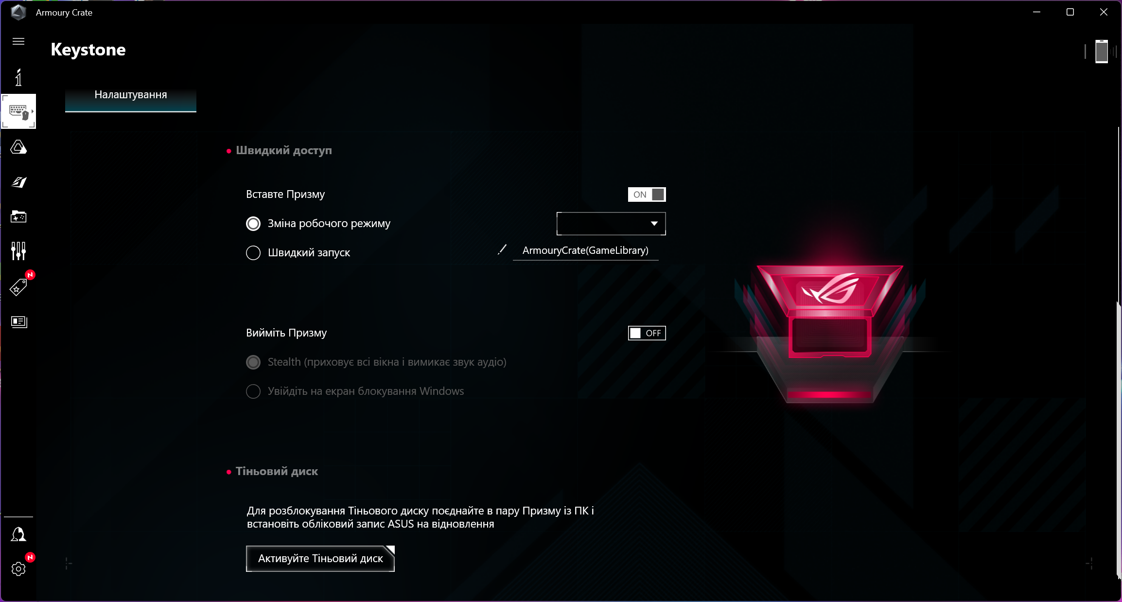 Далее можно выполнить управление функциями ключа безопасности Keystone. Кроме секретного раздела для личной информации, можно ассоциировать с ключом какие-то программы для быстрого запуска или назначить на него усиленный режим охлаждения. Затем для активации всех функций достаточно вставить ключ в боковую ячейку.