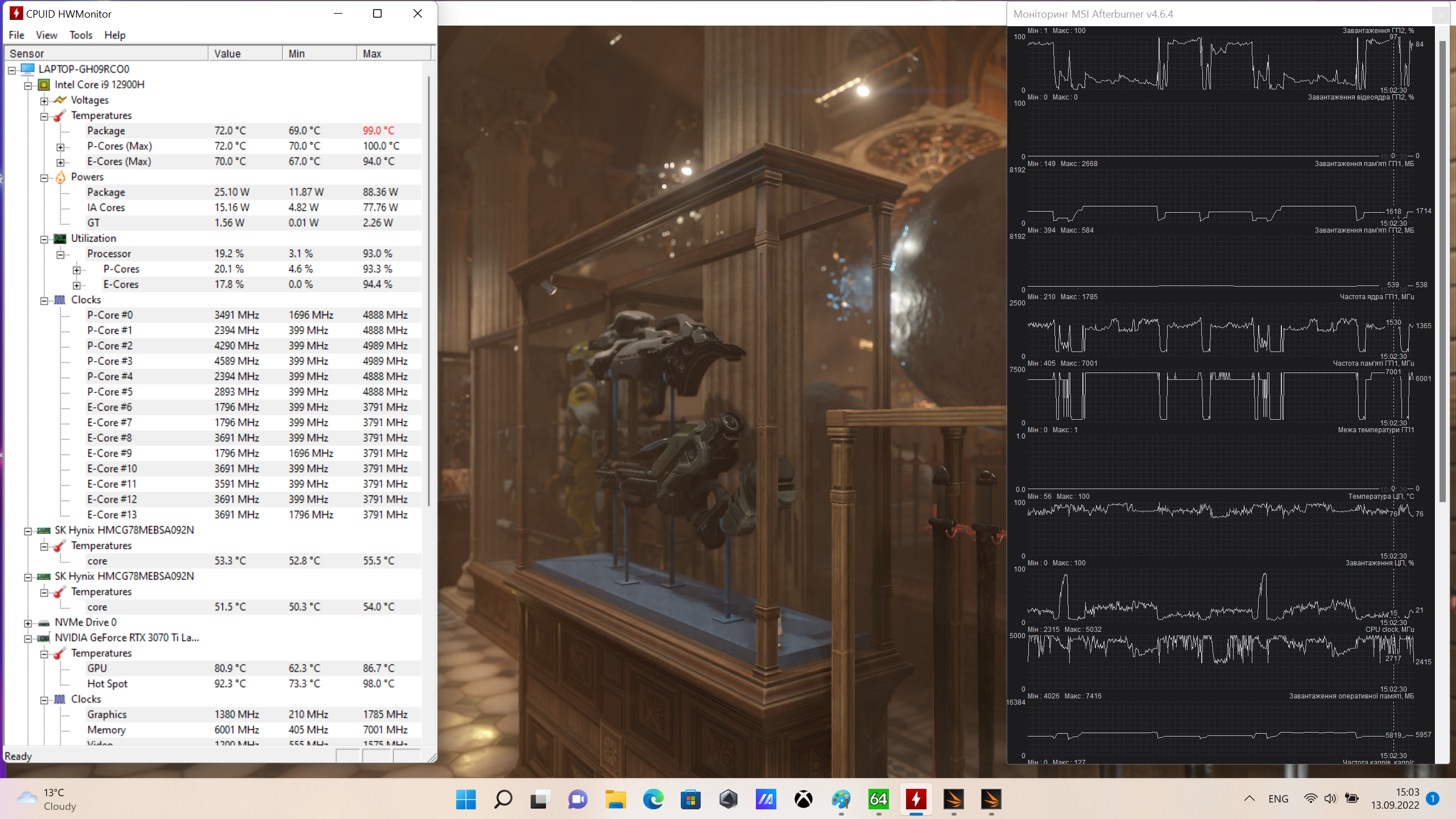 В графическом тесте, где привлекался 3DMark с тестом Time Spy в зацикленном режиме, процессор прогревался до 72–87 градусов с пиком в 100 °C, его частота достигала 5000 МГц и в среднем была на уровне 4200–4600 МГц. Видеокарта работала на 1380–1530 МГц с разгоном до 1785 МГц, при этом температура ядра достигала 86,7 градуса (98 °C для Hot Spot). Уровень шума – 40,2 дБА.