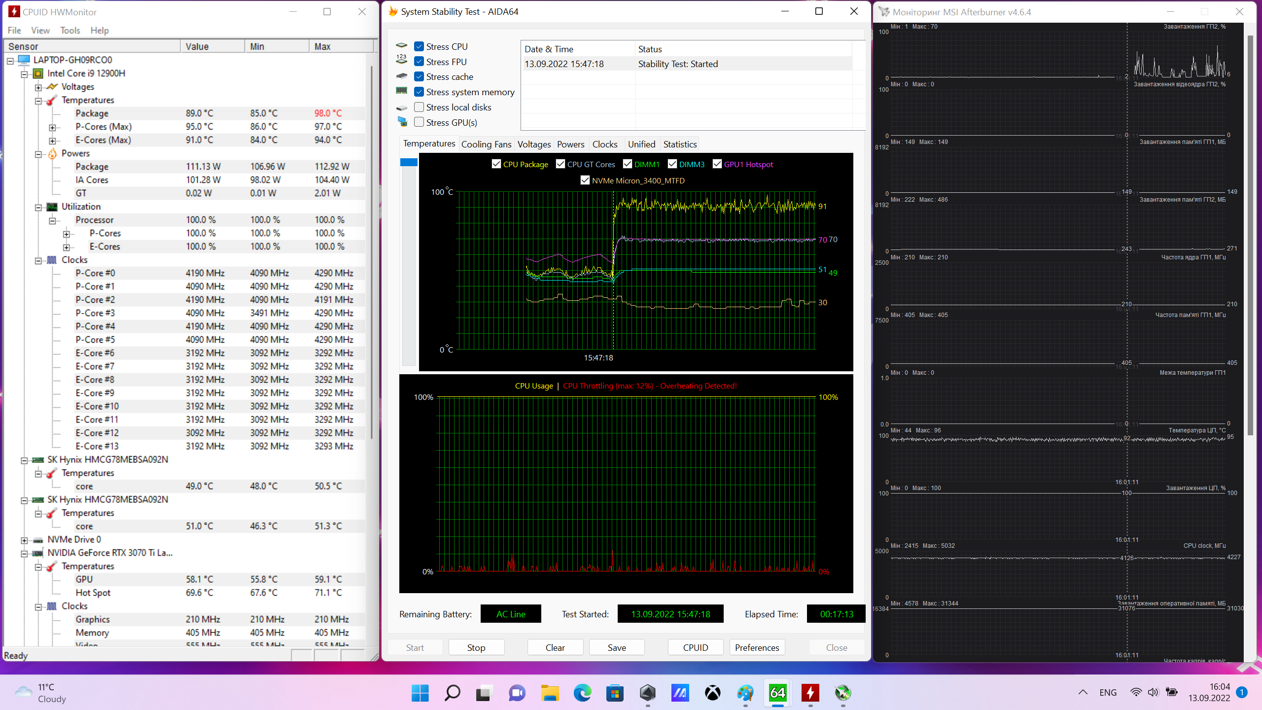 Благодаря этому частота CPU поддерживается на уровне 4100–4300 МГц, но средняя температура увеличивается до 95 градусов с пиком в 98 °C. Уровень шума тоже растет — до 48,5 дБА.
