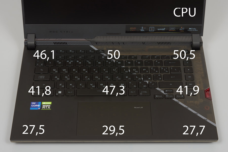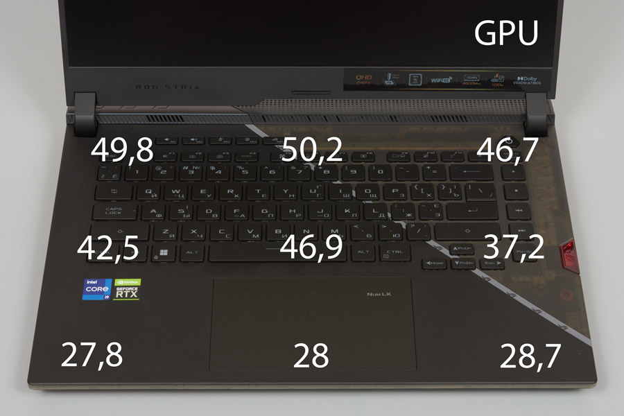 А вот температурные показатели порадовали. Причем эти показатели могут даже вызвать недоверие, но протестированный недавно ROG Zephyrus Duo 15SE со схожим оснащением показал примерно такие же результаты. А значит, это не ошибка тестирования. Да и субъективные ощущения заставляют согласиться с полученными значениями.